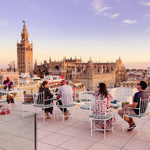Visit rooftop bars like EME Catedral Hotel or Hotel Doña María for cocktails with stunning views of the Giralda tower and cathedral, especially beautiful when lit up at night.